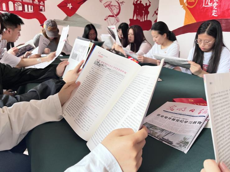 在窗明几净的活动室,全体参加同学拿起桌上的党报党刊,有的是《习近平著作选读》,有的是《人民日报》还有《求是》等精品报刊,所有人高声晨读,随后分享了各自的心得体会。